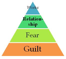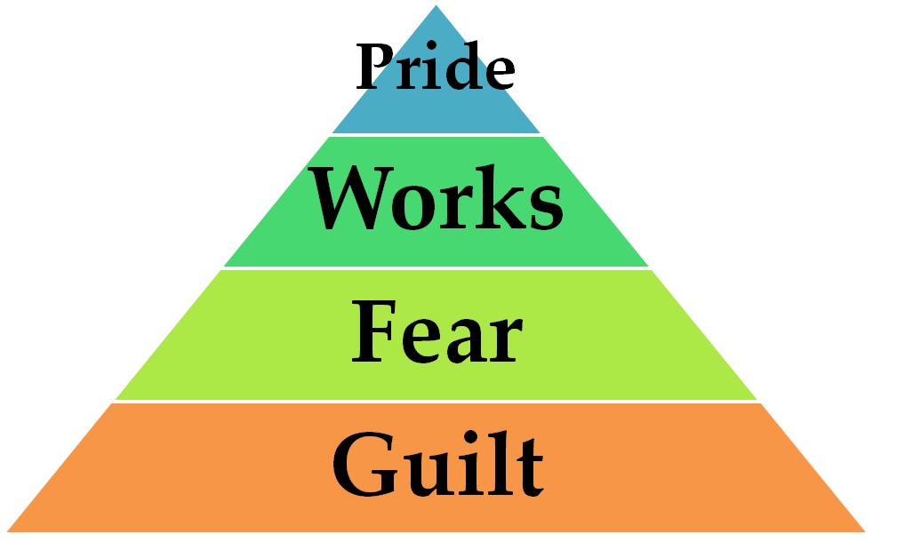 Imagine a pyramid which represents religion. The base is guilt, upon which is laid fear. Religion uses guilt and fear to incite works to appease which when applied results in pride.